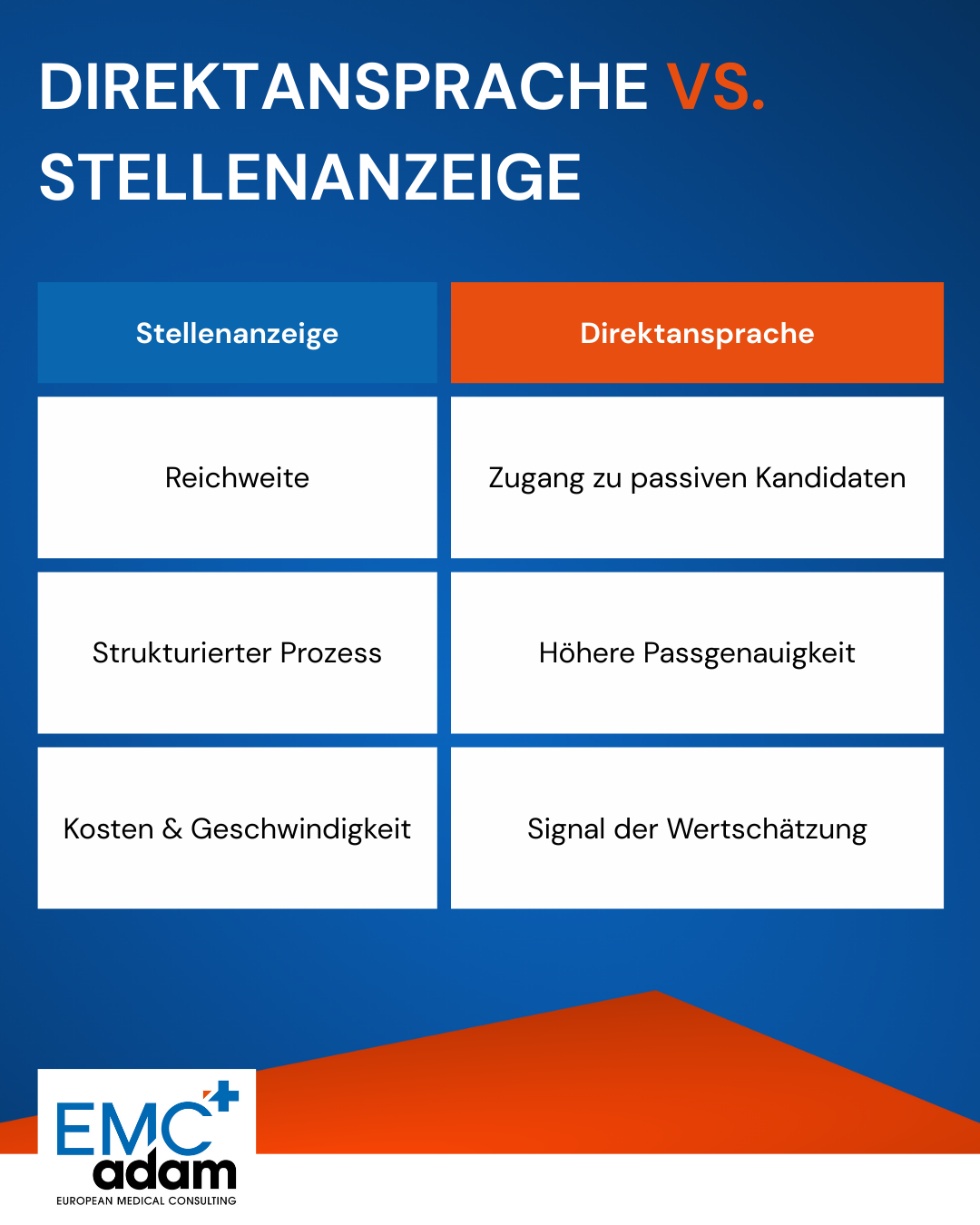 Aus über 20 Jahren Erfahrung weiß EMC Adam: In vielen medizinischen Bereichen führt nur die Direktansprache zum Ziel. Mit über 20.000 qualifizierten und wechselbereiten Kandidaten im eigenen Pool und einem Team spezialisierter Berater gelingt es, passende Persönlichkeiten schnell und zuverlässig zu identifizieren. Entscheidend ist dabei weniger das formale Ausschreiben, sondern das persönliche Gespräch, das Türen öffnet, die durch eine klassische Anzeige verschlossen bleiben.