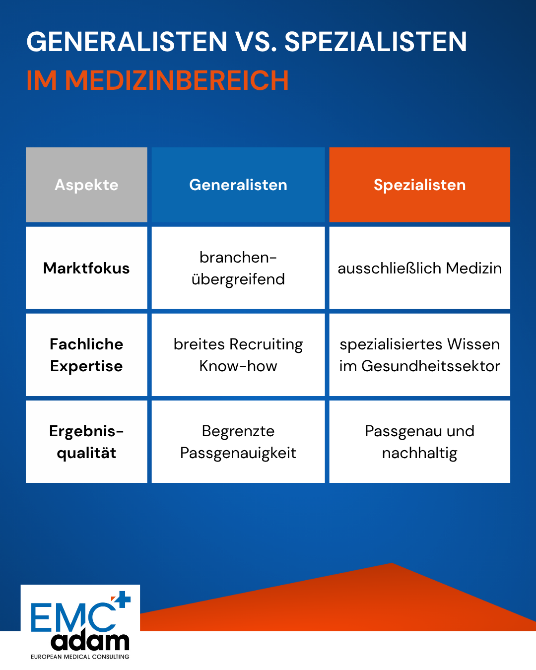 Allerdings kommt hier nun der oben beschriebene Aspekt ins Spiel, dass es sich bei medizinischen Einrichtungen um Klienten mit einem ganz besonderen Arbeitsalltag handelt. Die intime Kenntnis dieses Arbeitsalltags fehlt den generalistisch aufgestellten Anbietern oft. Für zielorientiertes Recruiting ist dieses spezifische Fachwissen zu den besonderen Anforderungen der Gesundheitsbranche Voraussetzung. Hier geht es beispielsweise um die nötigen Qualifikationen, Zertifizierungen und rechtlichen Rahmenbedingungen. Das kann dazu führen, dass die Auswahl der Kandidaten weniger passgenau erfolgt und offene Stellen nicht im erforderlichen Qualitätsniveau besetzt werden.