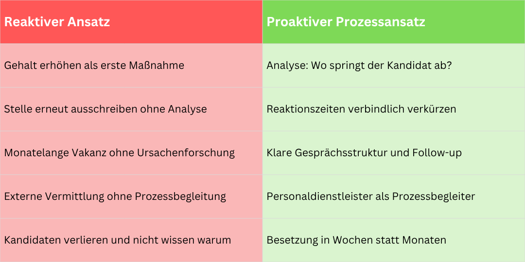 ✕ Zu viele Entscheidungsebenen: Wenn ein Angebot durch fünf Gremien muss, bevor es versendet wird, ist der Kandidat längst weg. Entscheidungshoheit muss dort liegen, wo der Prozess stattfindet.